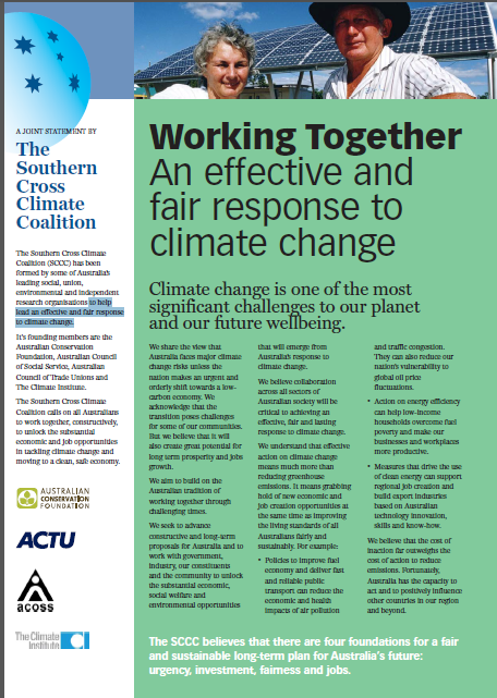 The SCCC was set up ‘to help lead an effective and fair response to climate change.’ The coalition called on ‘All Australians to work together to unlock substantial economic and job opportunities in tackling climate change and moving to a clean, safe economy.’