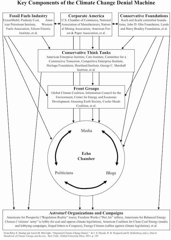 Dunlap, R. and McCright A. 2011: A graphic “Key components of Climate Change Denial Machine” from Organized Climate-Change Denial. IN Dryzek, J, Norgaard, R. and Schlosberg, D. (eds) Oxford Handbook of Climate Change and Society. New York: Oxford University Press, p.147