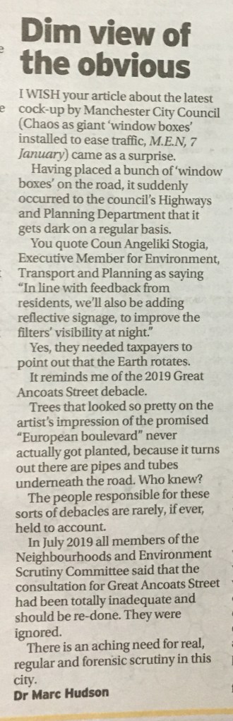 I wish your article about the latest cock-up by Manchester City Council (Chaos as giant ‘window boxes’ installed to ease traffic, MEN, 7 January) came as a surprise.