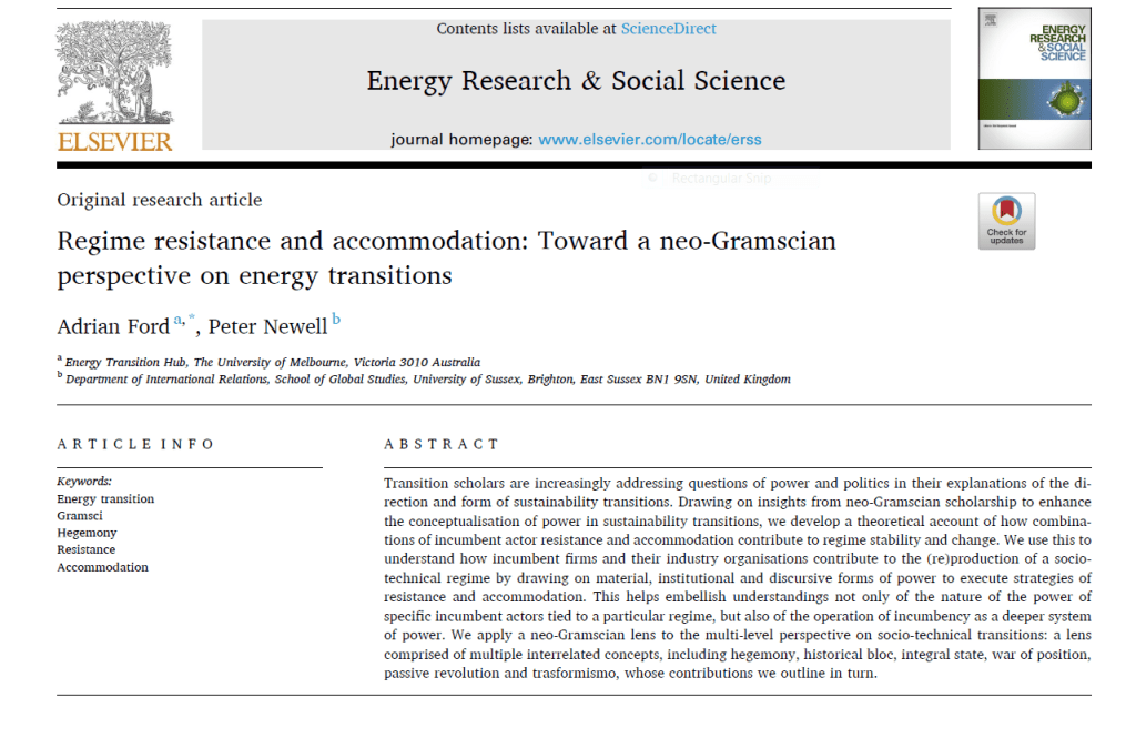 “Regime resistance and accommodation: Toward a neo-Gramscian perspective on energy transitions” and here’s a screengrab with the abstract (the bit at the top of most academic articles – acts as a summary/”should I bother reading this” kinda thing.