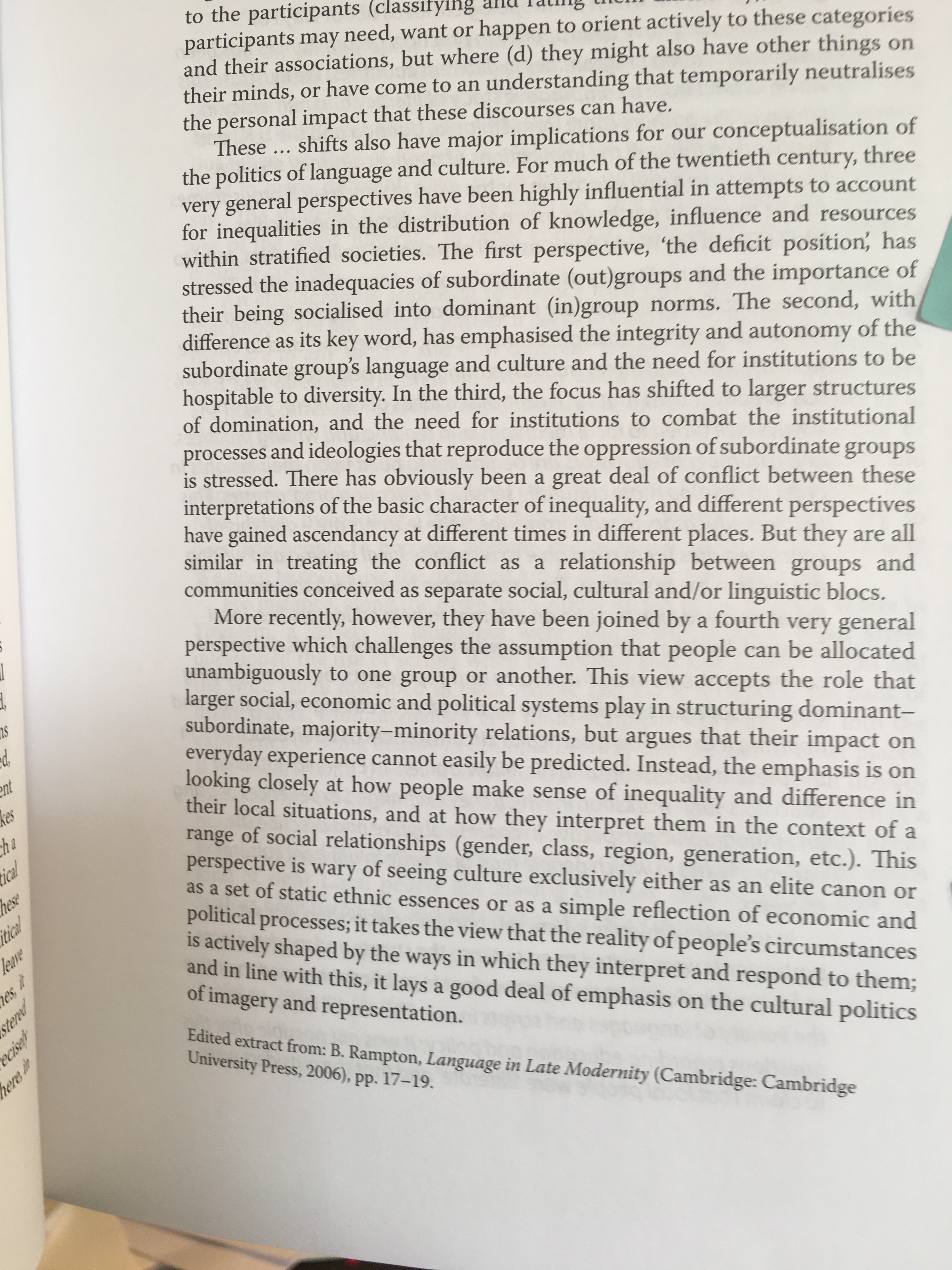 In Language in Late Modernity B. Rampton has a great section on shifting conceptualisations of the politics of language and culture in the twentieth century. The “deficit” position, the “integrity of the subordinate group” position and the “larger structures of domination” position, with a new “very general perspective which challenges the assumption that people can be allocated unambiguously to one group or another.”