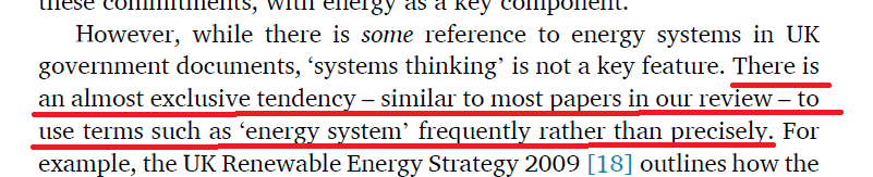 However, while there is some reference to energy systems in UK government documents, ‘systems thinking’ is not a key feature. There is an almost exclusive tendency – similar to most papers in our review – to use terms such as ‘energy system’ frequently rather than precisely.