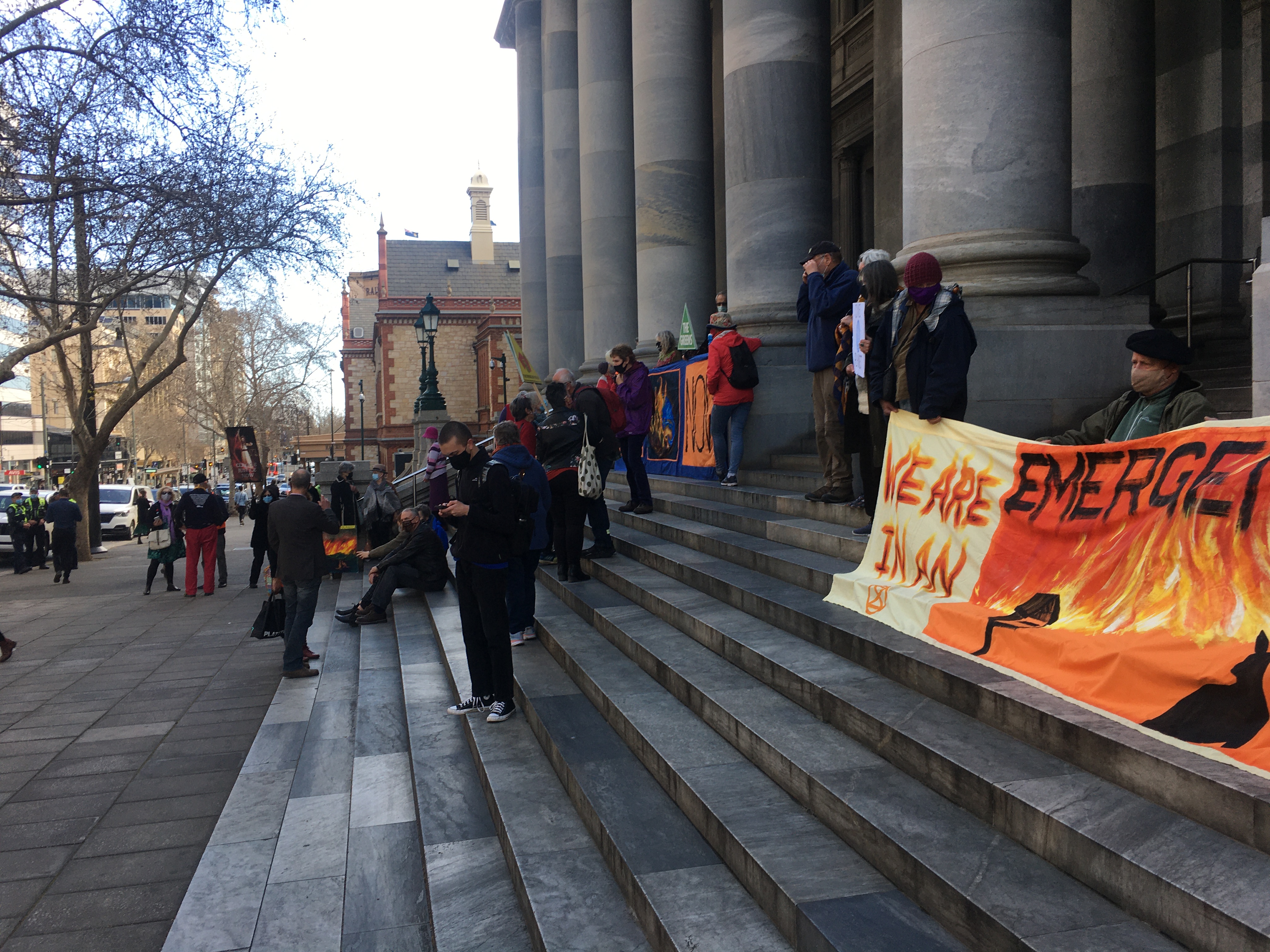 The longer version: Around sixty people, many aged sixty or more, gathered on the steps of the State Parliament of South Australia at 1.30 today. The aim was to give a shot in the arm to the petition (over 10,000 signatures) calling on state politicians to declare a climate emergency. [The year before last I attended a microcosm of this – a seaside council not declaring a climate emergency.]