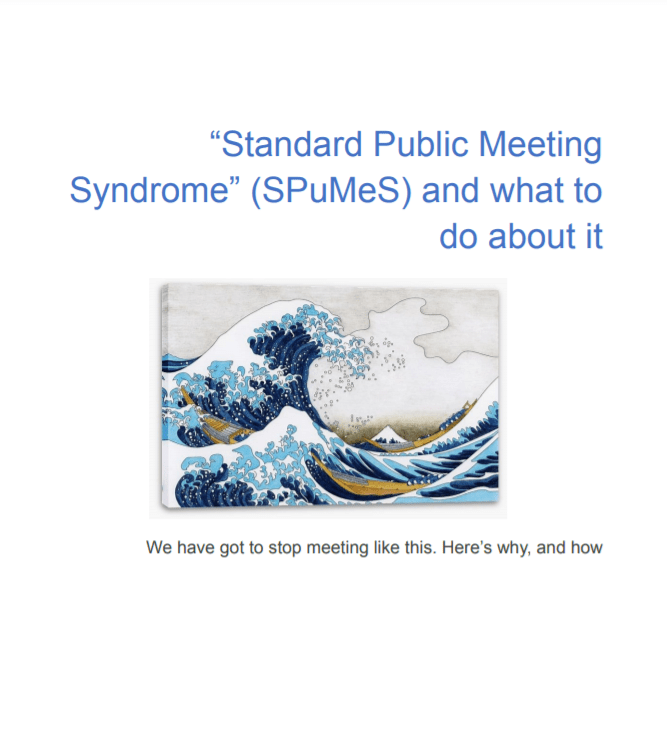 Public Meetings are disastrously bad at achieving their goals. They are not the only reason that social movement organisations struggle to recruit or retain people, but they are a significant barrier to a Better World ™.