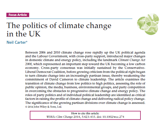 Carter, N. 2014. The politics of climate change in the UK WIREs Clim Change 2014, 5:423–433. doi: 10.1002/wcc.274