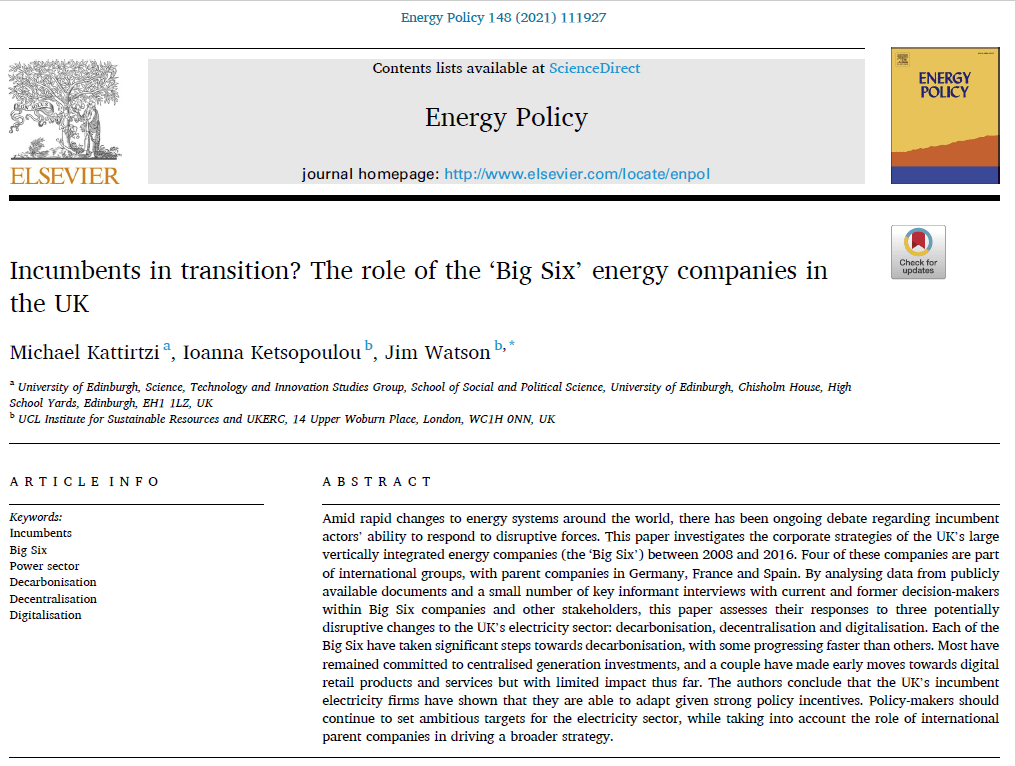 Kattirtzi, M., Ketsopoulou, I., and Watson, J., 2020. Incumbents in transition? The role of the ‘Big Six’ energy companies in the UK. Energy Policy, 148A, 111927.