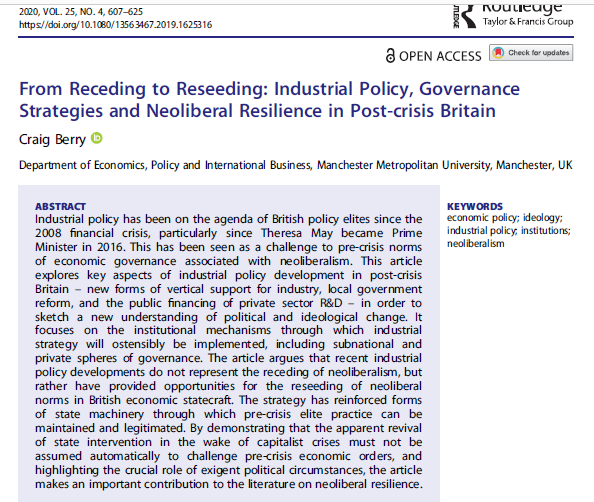Berry C. (2020) From Receding to Reseeding: Industrial Policy, Governance Strategies and Neoliberal Resilience in Post-crisis Britain, New Political Economy, 25:4, 607-625, DOI: 10.1080/13563467.2019.1625316