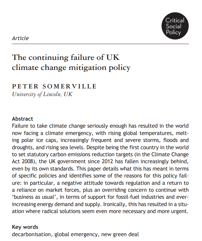 “UK governmental approaches to climate change have been consistently characterised by failure to meet their own specified aims and targets and complacency in the face of this failure (Ray et al., 2007; Martin et al., 2012). The main political parties have adopted a largely rhetorical ‘progressive’ green discourse as a means to capture the growing green median vote (Helm, 2010), signifying the emergence of a ‘competitive consensus’ (Carter and Jacobs, 2014: 137). Policy approaches to climate change have been confused and incoherent, variously emphasising four ‘storylines’: the need for technological innovation in energy generation, reducing energy demand, pricing carbon, and playing down the UK’s responsibilities in this policy area (Lovell et al, 2009). None of these approaches challenges the incumbent fossil-fuel and extractive capitalism that is primarily responsible for greenhouse gas (GHG) emissions, not just in UK (Brown and Spiegel, 2017; Monbiot, 2019) but throughout the world (Curtis, 2018; Oberle et al, 2019) ” (Somerville, 2020: 629-30)