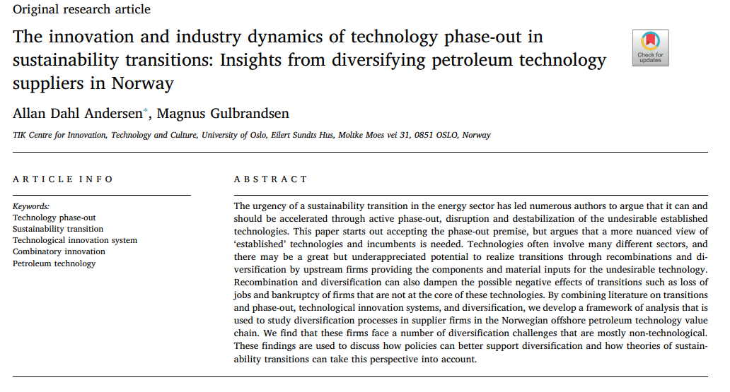 Andersen, A. and Gulbrandsen, M. 2020. The innovation and industry dynamics of technology phase-out in sustainability transitions: Insights from diversifying petroleum technology suppliers in Norway, Energy Research & Social Science 64 (2020) 101447, https://doi.org/10.1016/j.erss.2020.101447
