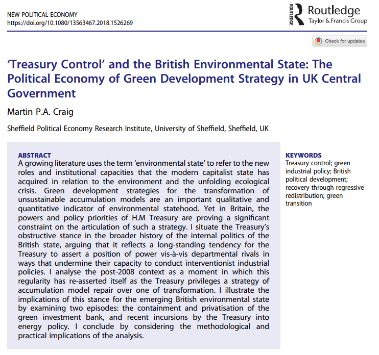 Craig, M. 2020. ‘Treasury Control’ and the British Environmental State: The Political Economy of Green Development Strategy in UK Central Government New Political Economy. 25 (1) https://www.tandfonline.com/doi/full/10.1080/13563467.2018.1526269