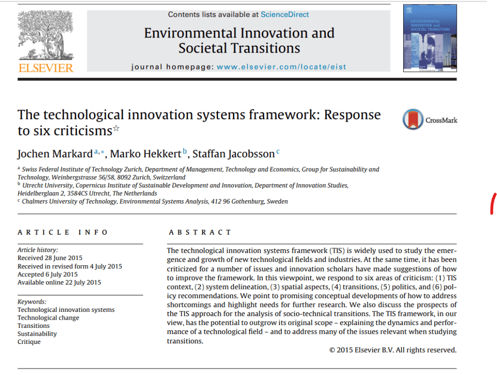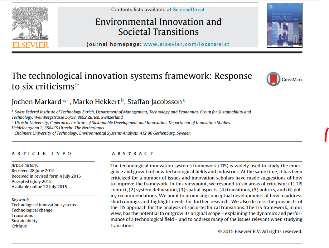 Markard, J., Hekkert, M and Jacobsson, S. 2015. The technological innovation systems framework: Response to six criticisms. Environmental Innovation and Societal Transitions 16, 76–86