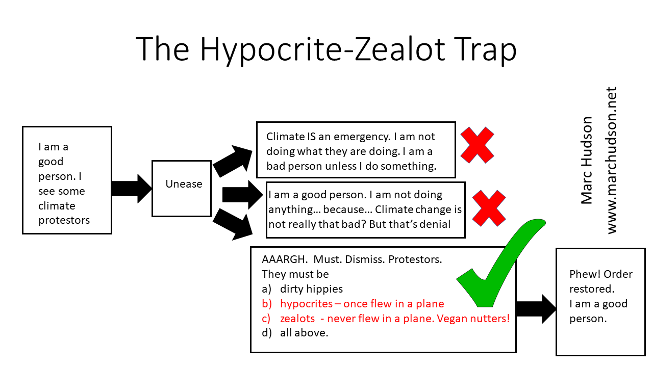 However, if you have not been complicit – never flown, never worn clothes made with fossil fuels, never had a takeaway etc etc – then you are weirdo out-of-touch zealot, and can be ignored.