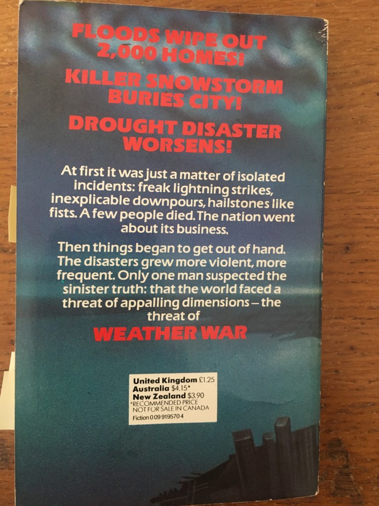 On a bit of a weather/climate-disaster novels kick at the moment (“The Sixth Winter” by Orgill and Gribbin). The Weather War is one I bought a while back and it just sat on the shelf.