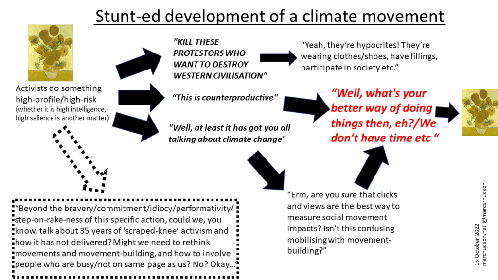 4. That means we have to think about the difference between one-offs (and to be clear, Just Stop Oil have been doing these sorts of things – at infrastructure, on sporting fields, at Formula One, on the streets) – and a sustained campaign. And we have to think about the difference between mobilising and movement-building. Which would bring in the dandelion thing – whether if what you are doing “makes sense” and is replicated elsewhere (in the way the school strikes, briefly, in 2018 and 2019 did).