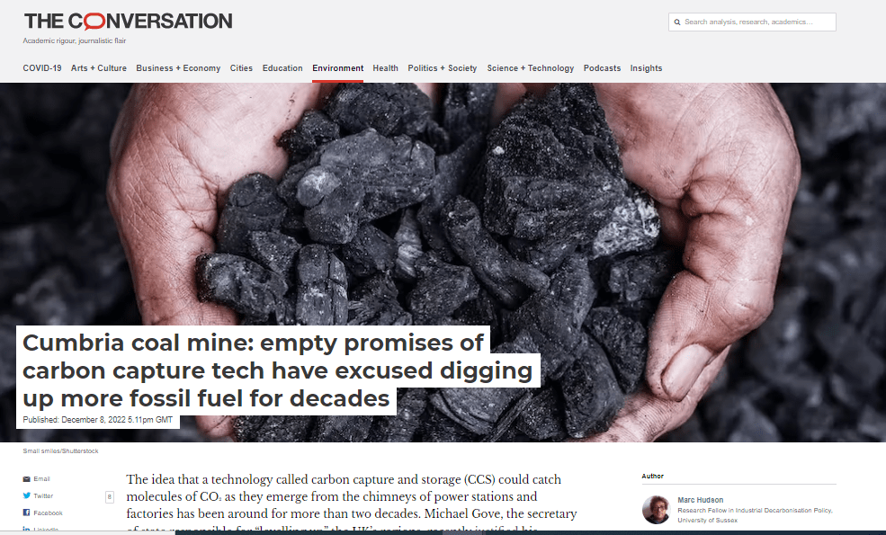 But I will say this. What Michael Gove did yesterday – invoking CCS to excuse his Whitehaven decision – is an opportunistic farce. Not only is it an insult to all those people who have slogged their guts out to try to make CCS ‘work’, but it risks CCS’s fragile reputation for momentary political convenience.