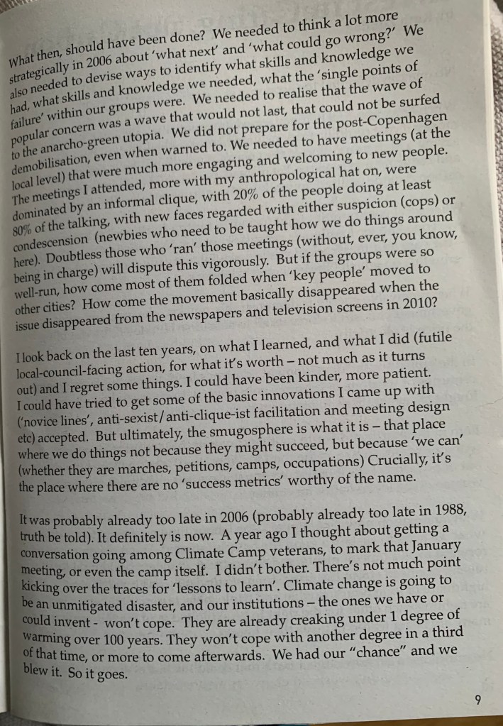 “Ten Years since [the first] Climate Camp” In 2016 some people put together a booklet to mark the ten year anniversary of the first “Camp for Climate Action.” They published this among the various pieces- Share this: Click to share on X (Opens in new window) X Click to share on Facebook (Opens in new window) Facebook Like Loading... Related Leave a comment Cancel reply Δ