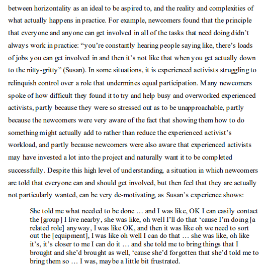 One of the things that makes movement-building so difficult is this; a social movement organisation is going to be made up of people with years under the belt who (usually) have skills, knowledge and relationships at their fingertips and also “newbies” (the term is common, but misleading and patronising – they may have lots of experience, either from other movements or from real-life experience!) Even if the experienced ones see the need for creating opportunities for “newbies” to learn the ropes, it can still break down.
