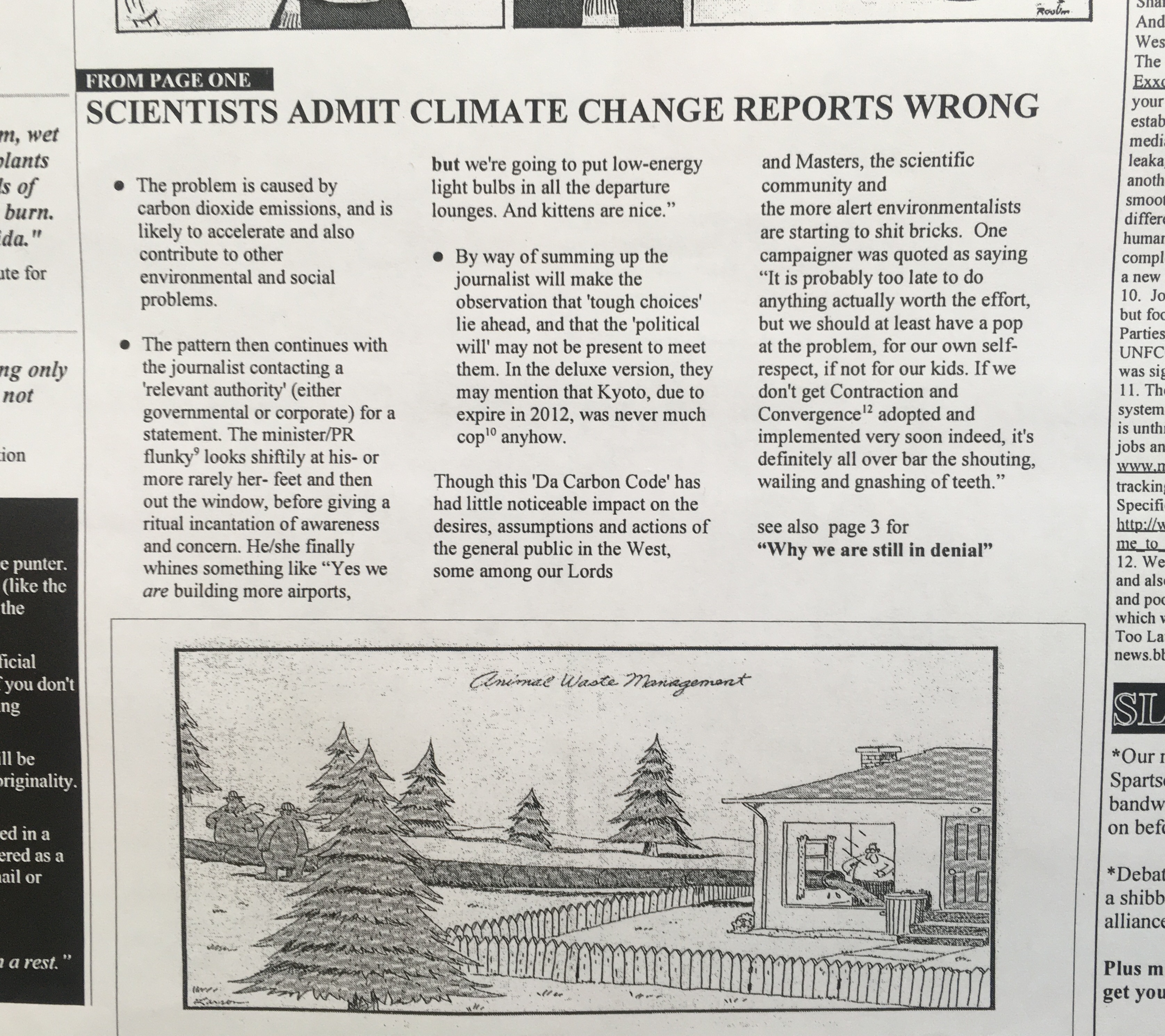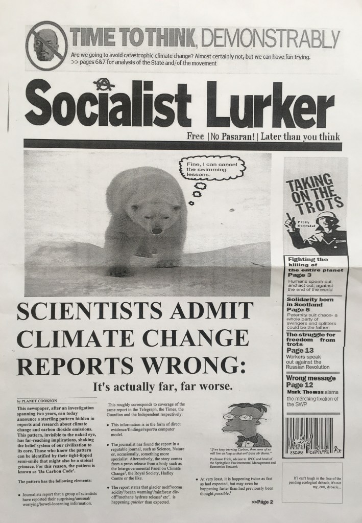 In the aftermath of Climate Camp in 2006 I decided to spoof the SWP’s dire “Socialist Worker” newspaper, and then hand them out at the “what next” meeting in Manchester. I do have a full physical copy lying around somewhere (god I need to clear out some stuff).