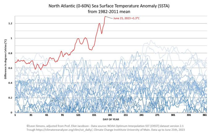 The red line is the North Atlantic surface sea temperatures for this year, All the other lines below it every other line that we have data for.