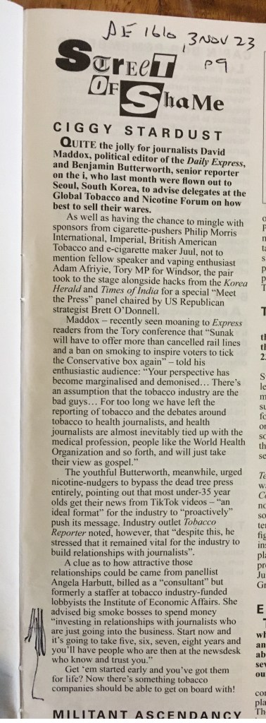 On the tobacco thing – what is particularly interesting, (not from a mundane ‘snouts in the trough’ but rather from a power perspective, is the insouciance with which the plotters can be assured that an eight year investment will be made, and pay off. I don’t know of any “dissident” groups that think like that (why would you, how could you?) Such are the privileges of sitting on piles and piles of money.
