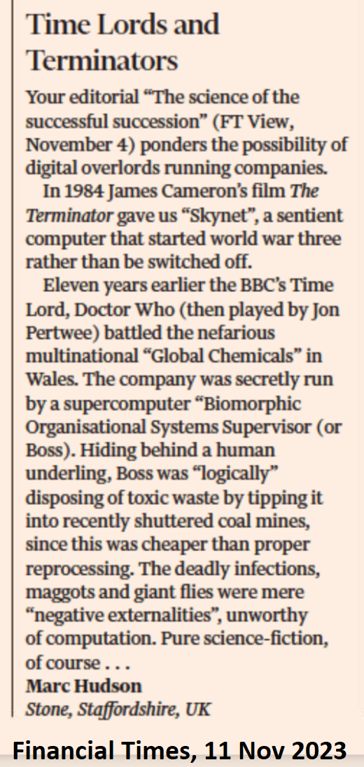 Eleven years earlier the BBC’s Time Lord Doctor Who (then played by Jon Pertwee) battled the nefarious multinational “Global Chemicals” in Wales. The company was secretly run by a supercomputer “Biomorphic Organisational Systems Supervisor. (“BOSS”). Hiding behind a human underling, BOSS was ‘logically’ disposing of toxic waste by tipping it into recently shuttered coal mines, since this was cheaper than proper reprocessing. The deadly infections, maggots and giant flies were mere “negative externalities”, unworthy of computation.