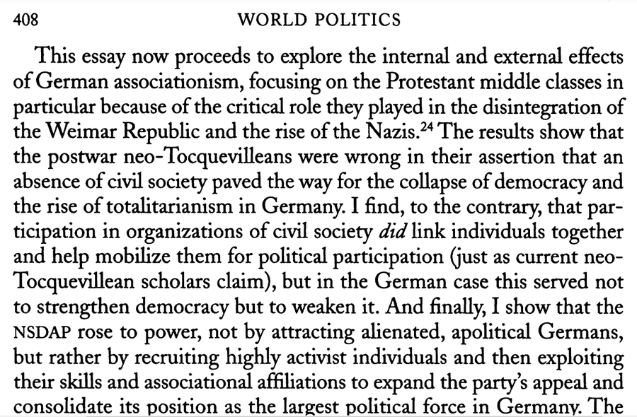 Berman, S. 1997. Civil Society and the Collapse of the Weimar Republic. World Politics , Vol. 49, No. 3, pp. 401-429.
