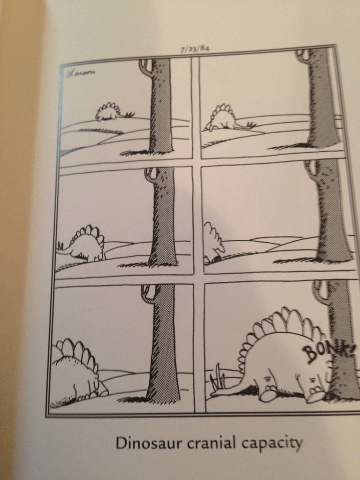 Mental note to self – dig out the Far Side cartoon with the stegosaurus and the tree. Ah, by the power of Google…