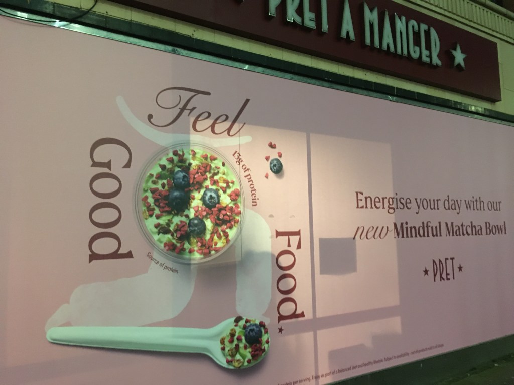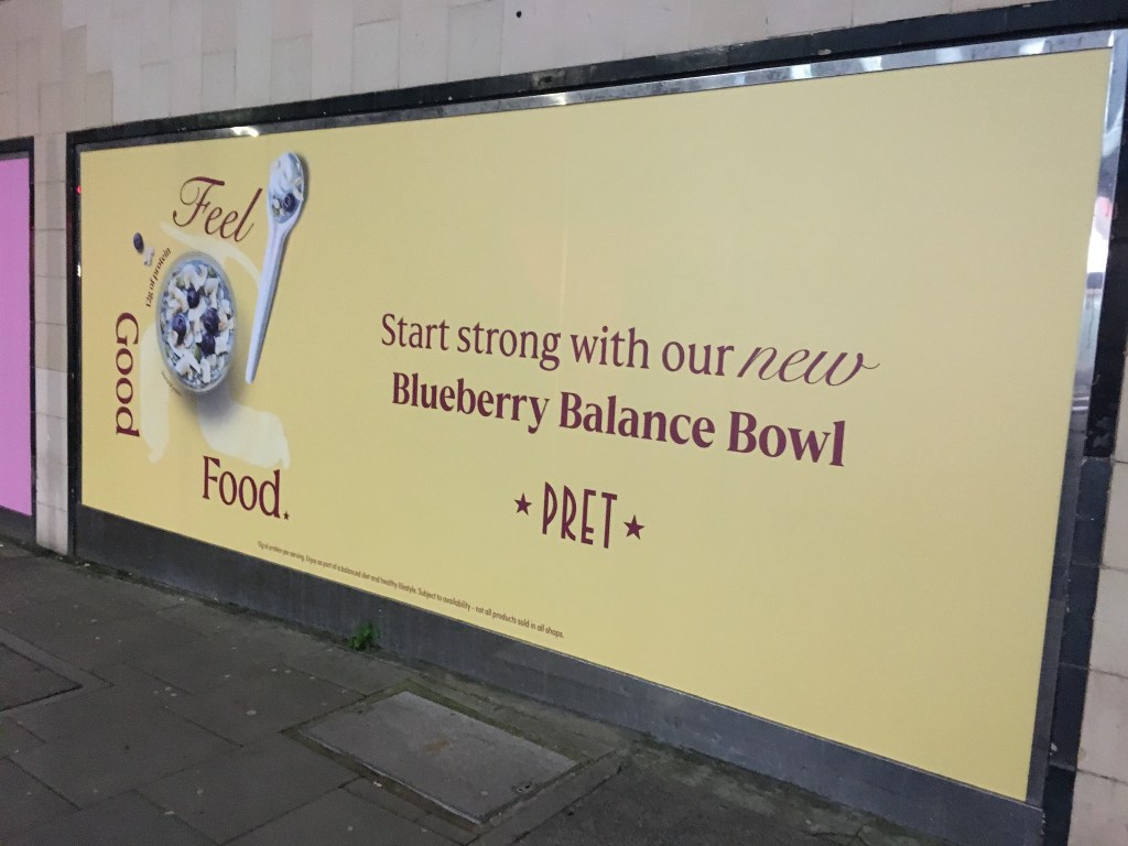 On the corner of Euston Road and Judd Street I saw two workmen beginning to put up two huge (size of the whole windows) posters on the Pret windows. When I came back, they were almost done. One was pink, and the other was, I think, green. (I can check on Friday, perhaps, if I have time).