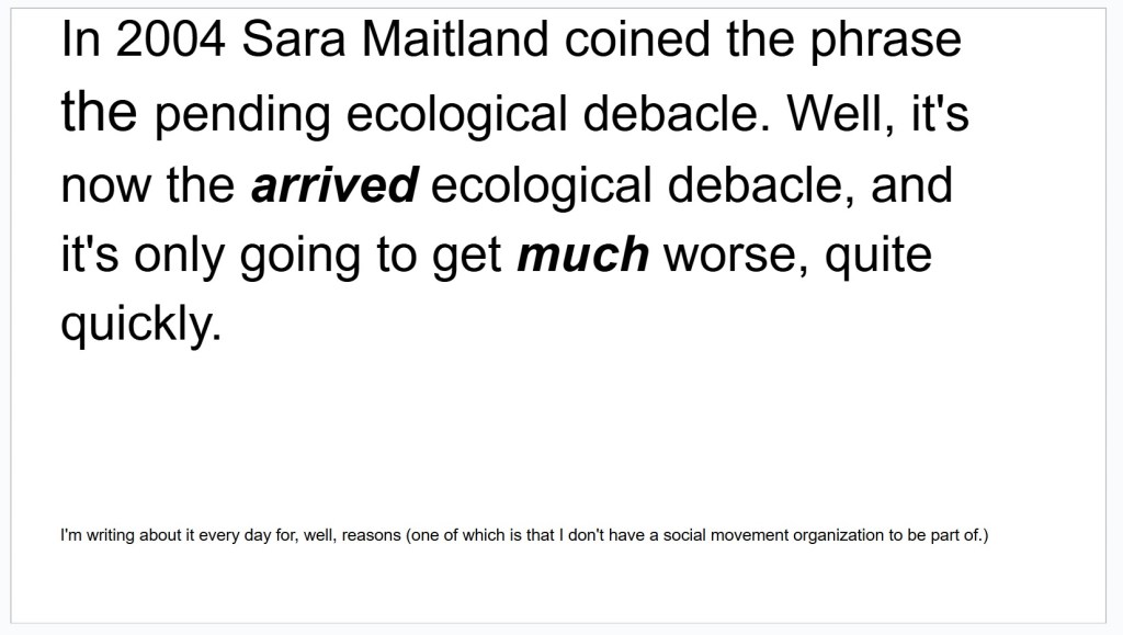 This year I am going to write something short, daily, about what is going on – “2 cents on the Arrived Ecological Debacle” (2cotAED). I have to write it; you don’t have to read it. If you DO read it, feel free to tell me how wrong I am (and hopefully why). Re: the debacle aspect: in 2004 the English writer Sara Maitland wrote about the “pending ecological debacle.” The expression stuck with me; it’s a debacle because it was foreseen, warned about and was avoidable. Well, it’s no longer really “pending” is it?