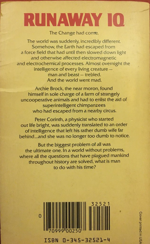 On IQ, see also that short story in the 2000AD annual of 1980, Flowers for Algernon by Daniel Keyes, IQ83 by Arthur Herzog, Brainwrack by Pedler and Davis (I’ve only read the last of these so far.)