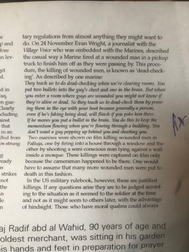To be crystal clear – If I were a soldier deployed to a war zone like that, I absolutely would be dead-checking, to improve my odds of being alive and getting back to “the World.” There’s a great documentary about a guy who was in Vietnam (who later went on to be heavily involved in anti-War stuff down in Florida, iirc who said just this about his time in country. He said that after an attack on his firebase he stared into the faces of all his dead friends and swore that from then on he would just kill everything and everyone who posed even a theoretical threat. (Obviously the problem lies in the “distinction” between an active firefight and the in-cold-blood-executions-for-the-lulz-bodycount stuff that Special Forces clearly got up to in Afghanistan…)