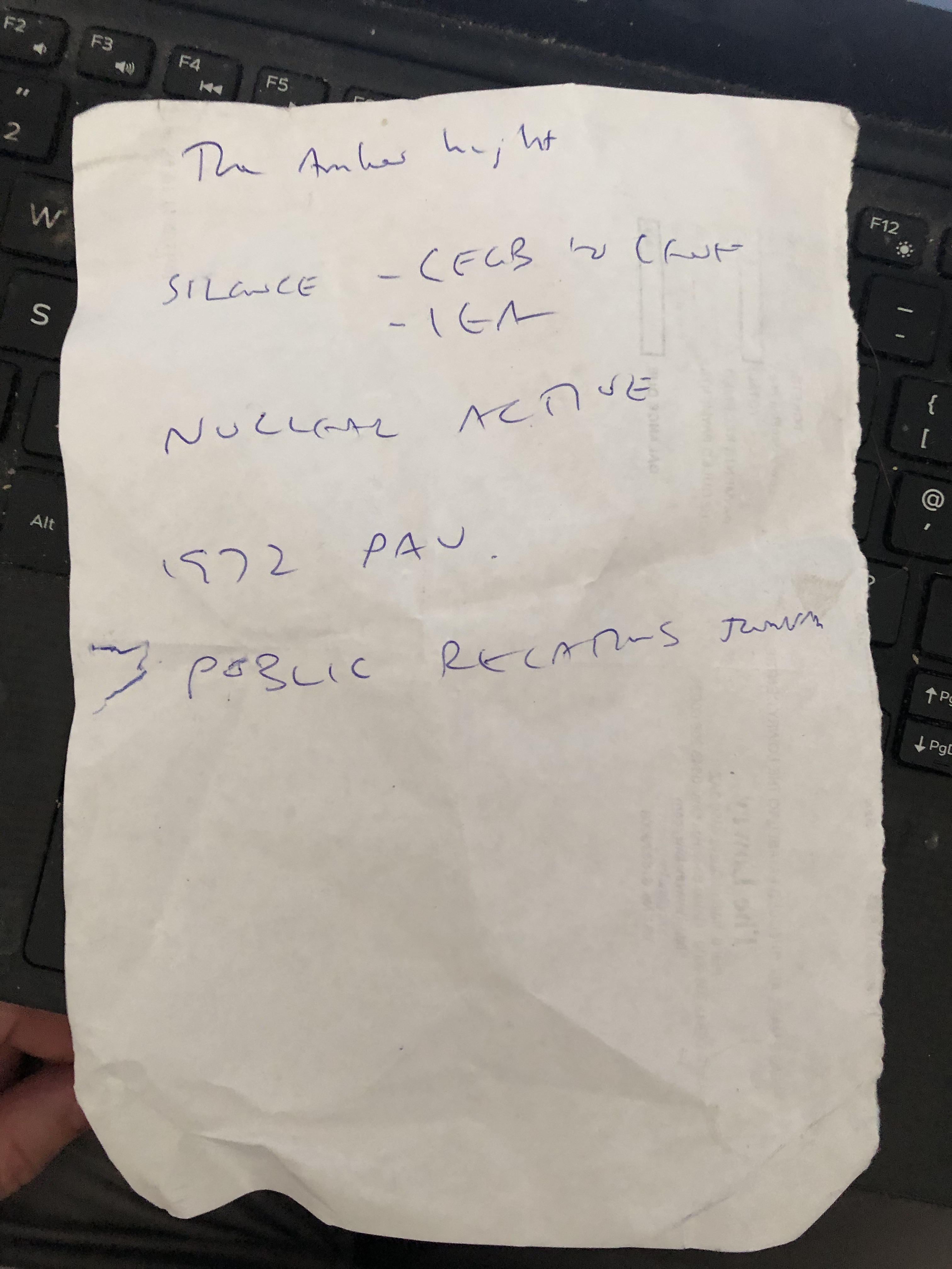 I am back in the habit of morning yomps (weighted jacket full of coins and a small backpack with some bricks) along the canal, and listening to a bunch of podcasts while throwing aquatic birdfood to the aforementioned moorhens, and swans. But I am supposed to be doing more narrating into my voice recorder, and have been neglecting that. So I reached for a high-tech fix – scribbling some notes to prompt myself. And it worked!
