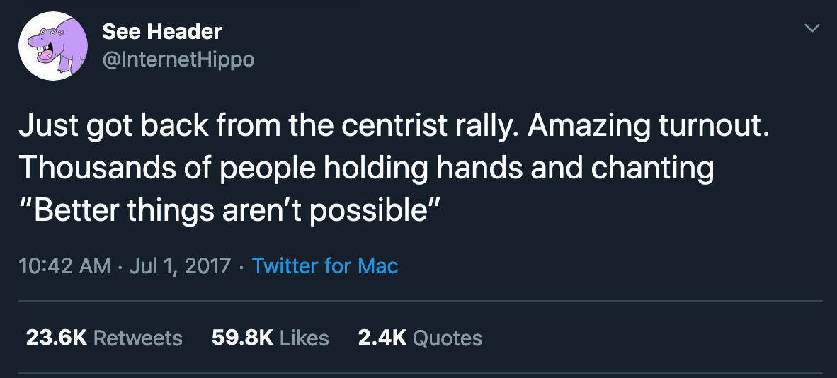 Blah blah “if you’re middle of the road you get hit by the traffic in both directions” blah blah.