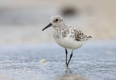 Sanderling (kind of bird) The Sanderling is a small, plump, energetic wading bird. It has a short and straight black bill and medium length black legs.