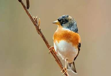 Brambling- The male Brambling has a black head in summer, and an orange breast with white belly. In flight it shows a white rump. Sociable in winter