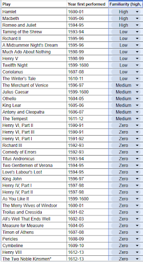 Here’s the list I am working from – of high familiarity (only Romeo and Juliet, Macbeth and Hamlet), medium, low and zero. I will start with the zeroes (as per astronaut Chris Hadfield’s advice, in a different meaning/context).